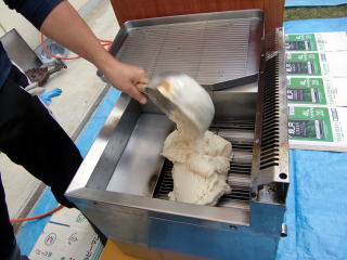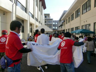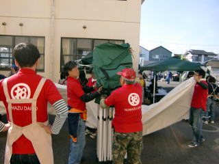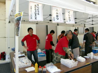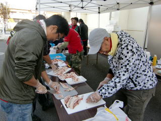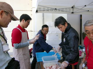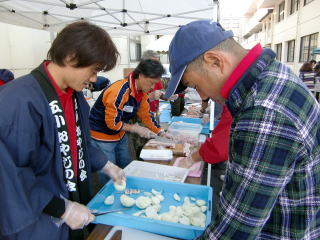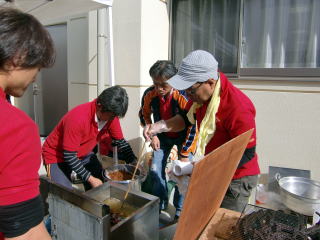 | 11月4日(日)秋晴れのおだやかなな天候に恵まれ、五中バザー&コミュニティ祭が行われました。 第五おやじの会では、昨年よりここで揚げ物屋を開いています。! 今年のメニューは、串かつとハムかつとあげまんじゅうです。 早朝より、テント設営と下準備に大忙しでした。 肉を切る人、玉ねぎを切る人、串にさす人、衣を付ける人、フライヤーで揚げる人・・・ 手際の良さには、定評があります。メンバーは、自分の役割を探して、自分で動きます。 手作り、あつあつの商品は、美味しいと好評でした。 皆さんのおかげで、串かつ230本、ハムかつ130枚、あげまんじゅう100カップ すべて完売しました。ありがとうございました。また来年、どんなオリジナルメニューが出るのか お楽しみに〜〜。 |