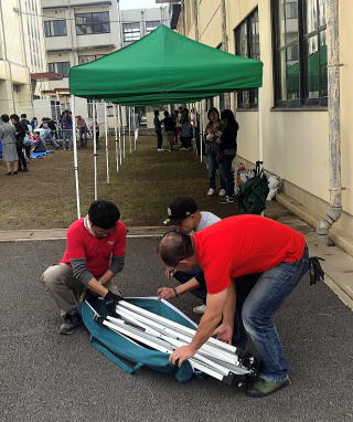 テント設営から フライヤー準備から みかんの袋詰めから