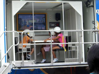 ・揺れに連動して、大型スクリーンに家具が転倒するCGが映し出されガラスが割れる音などの効果音により、臨場感が体験できます。