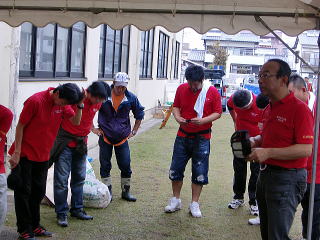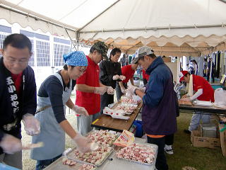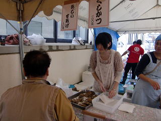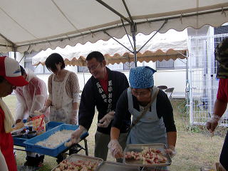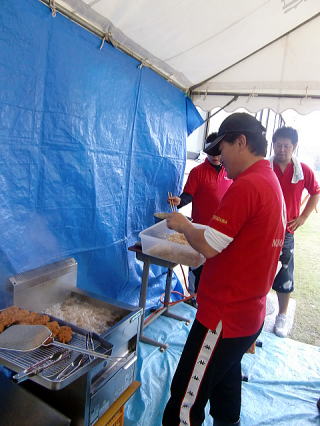 | 11月6日 (日) 天気予報通りの雨・・・(平日はずっと晴れていたのに・・) 五小バザー、開北バザーに続き、まさかの・・・3連続雨なんて・・・ でも、今日は五中バザーにおやじの会初出店の日です!!毎年、PTAのブースで焼き鳥の お手伝いをしているおやじの会ですが、今年は、ついに、揚げ物屋を開店!! 揚げたての 串かつ と 骨まで食べられるあじのひらきの素揚げは皆さんの働きかけのおかげで